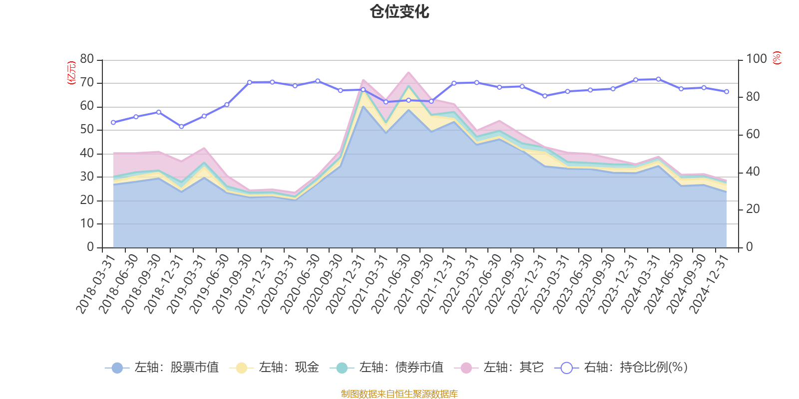 据定期报告数据统计,近三年平均股票仓位为85.3%,同类平均为80.05%。2024年一季度末基金达到89.73%的最高仓位,2018年末最低,为64.52%。