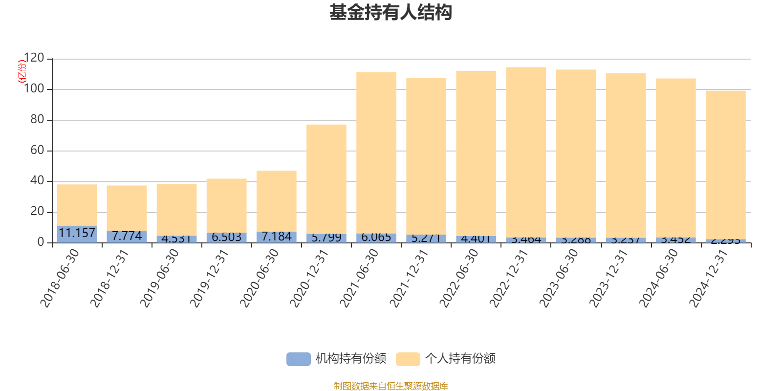 截至2024年12月31日,基金持有人共计143.42万户,合计持有99.09亿份。其中管理人员工持有962.16万份,占比0.10%,机构持有份额占比2.31%,个人投资者占比97.69%。