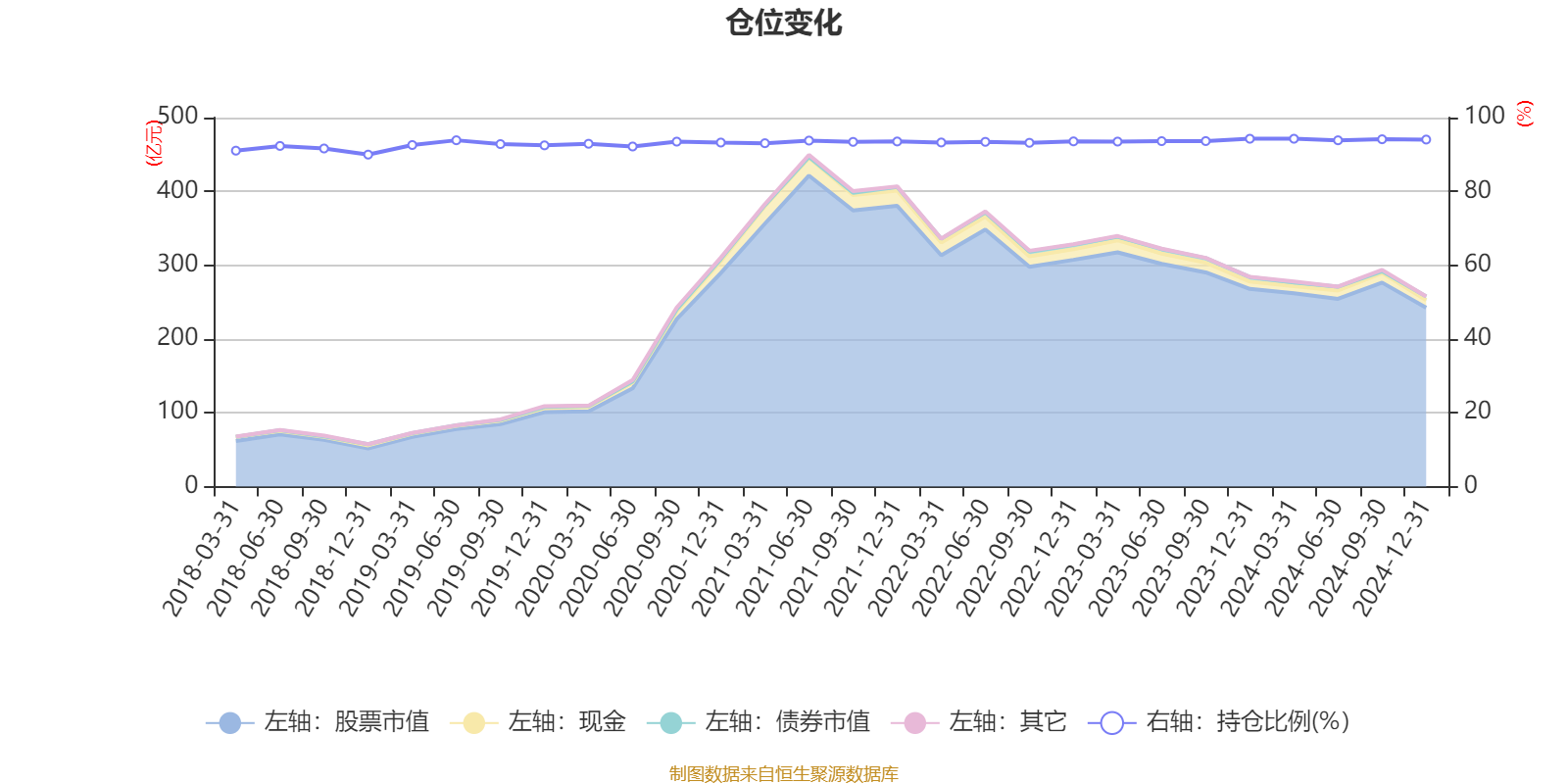 据定期报告数据统计,近三年平均股票仓位为93.73%,同类平均为87.14%。2023年末基金达到94.27%的最高仓位,2018年末最低,为89.97%。
