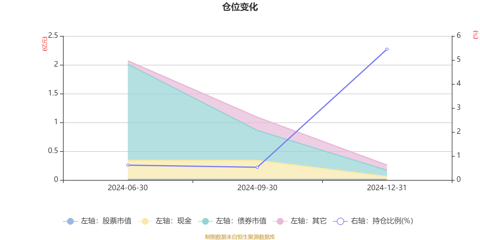 据定期报告数据统计,成立以来平均股票仓位为2.2%,同类平均为18.74%。2024年末基金达到5.45%的最高仓位,2024年三季度末最低,为0.53%。