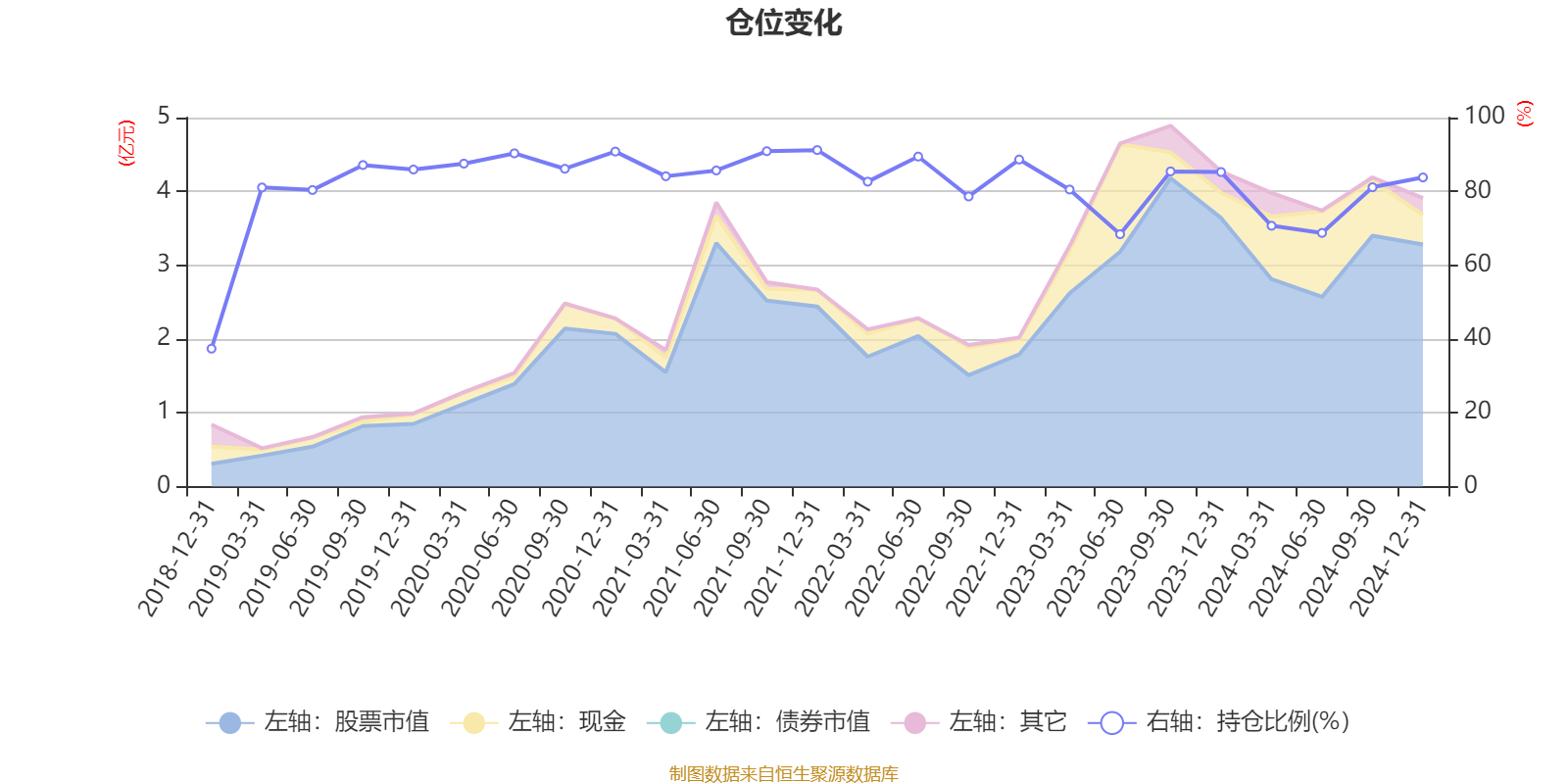 据定期报告数据统计,近三年平均股票仓位为80.27%,同类平均为84.66%。2021年末基金达到91.2%的最高仓位,2018年末最低,为37.38%。