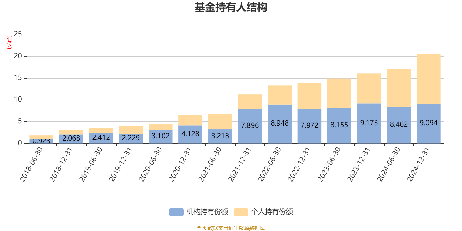 截至2024年12月31日,基金持有人共计46.95万户,合计持有20.49亿份。其中管理人员工持有431.75万份,占比0.21%,机构持有份额占比44.39%,个人投资者占比55.61%。