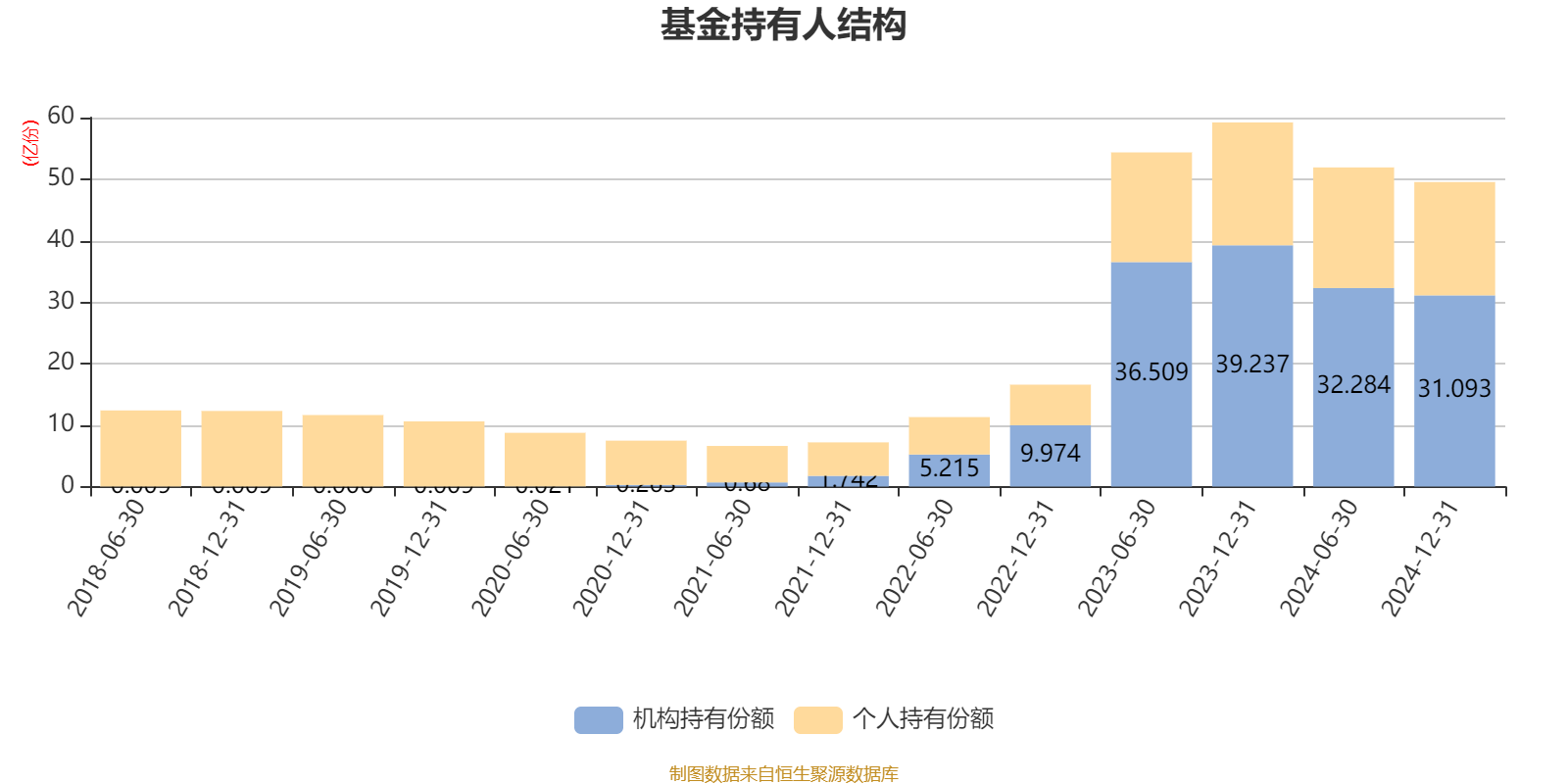 截至2024年12月31日,基金持有人共计30.34万户,合计持有49.52亿份。其中管理人员工持有439.42万份,占比0.09%,机构持有份额占比62.79%,个人投资者占比37.21%。