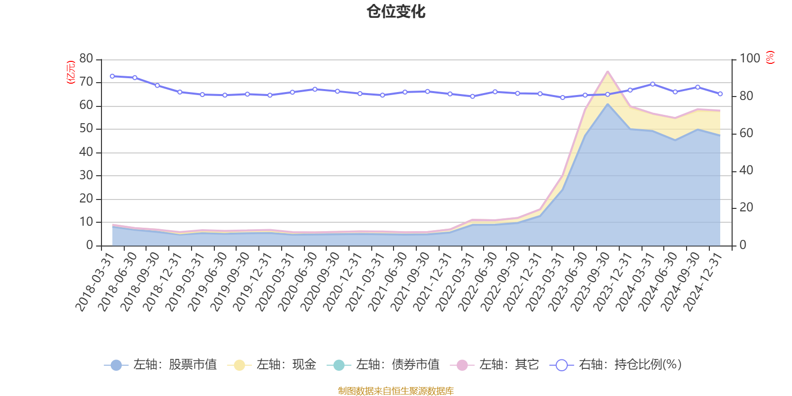 据定期报告数据统计,近三年平均股票仓位为82.27%,同类平均为88.58%。2018年一季度末基金达到90.99%的最高仓位,2023年一季度末最低,为79.55%。