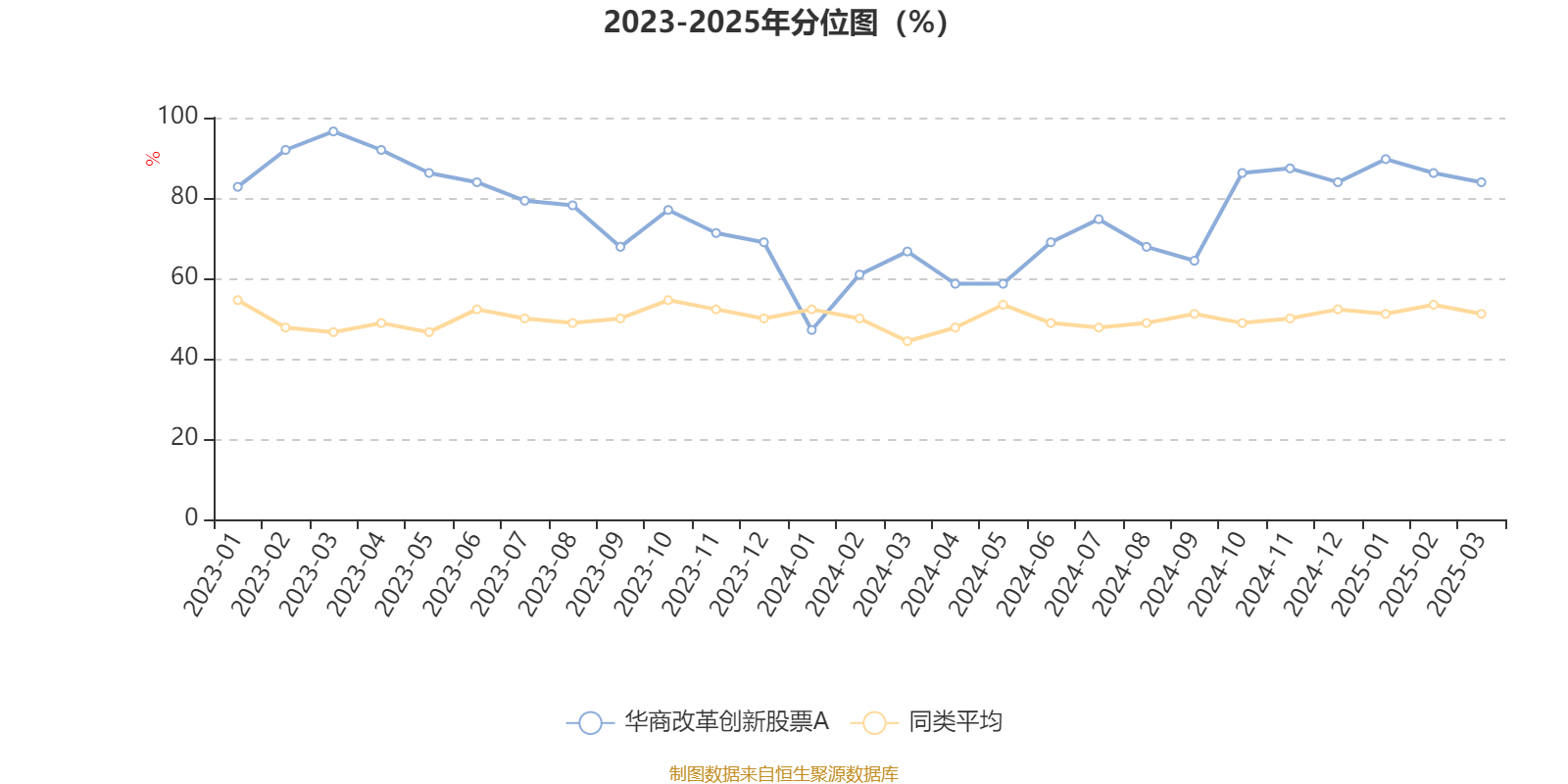 通过所选区间该基金净值增长率分位图,可以观察该基金与同类基金业绩比较情况。图为坐标原点到区间内某时点的净值增长率在同类基金中的分位数。
