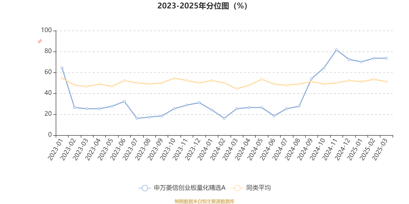 通过所选区间该基金净值增长率分位图,可以观察该基金与同类基金业绩比较情况。图为坐标原点到区间内某时点的净值增长率在同类基金中的分位数。
