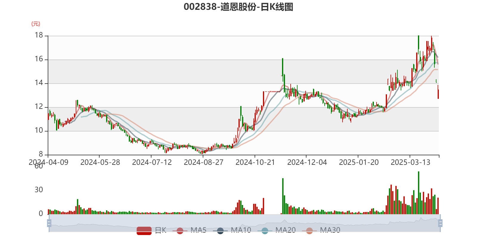 中证智能财讯道恩股份(002838)4月8日晚间披露业绩预告,预计2025年一季度归母净利润4236.44万元至4589.48万元,同比增长20%-30%;扣非净利润预计3512.17万元至3886.42万元,同比增长22%-35%;基本每股收益0.09元/股-0.1元/股。以4月8日收盘价计算,道恩股份目前市盈率(TTM)约为40.39倍-41.35倍,市净率(LF)约2.03倍,市销率(TTM)约1.15倍。