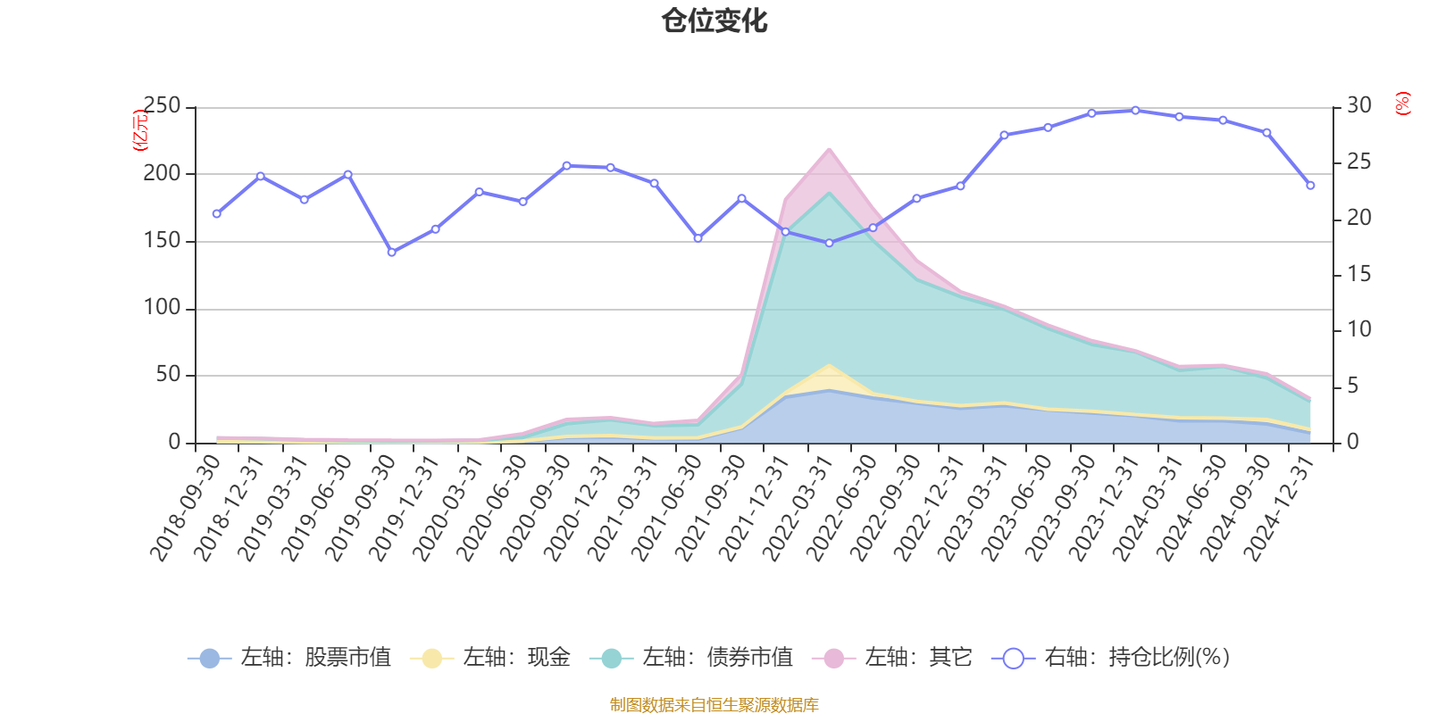 据定期报告数据统计,近三年平均股票仓位为25.45%,同类平均为18.51%。2023年末基金达到29.71%的最高仓位,2019年三季度末最低,为17.04%。
