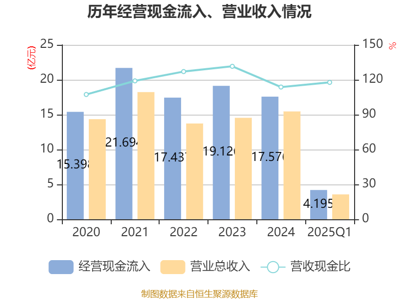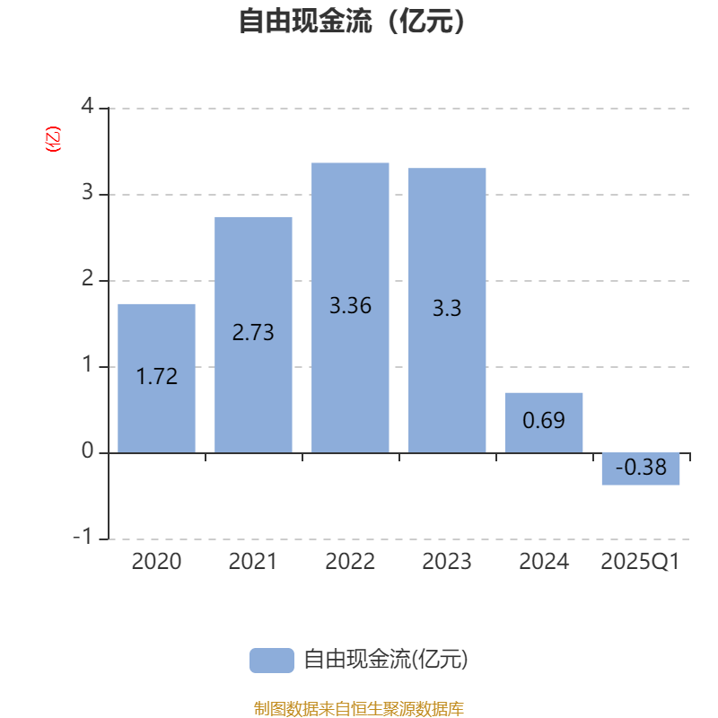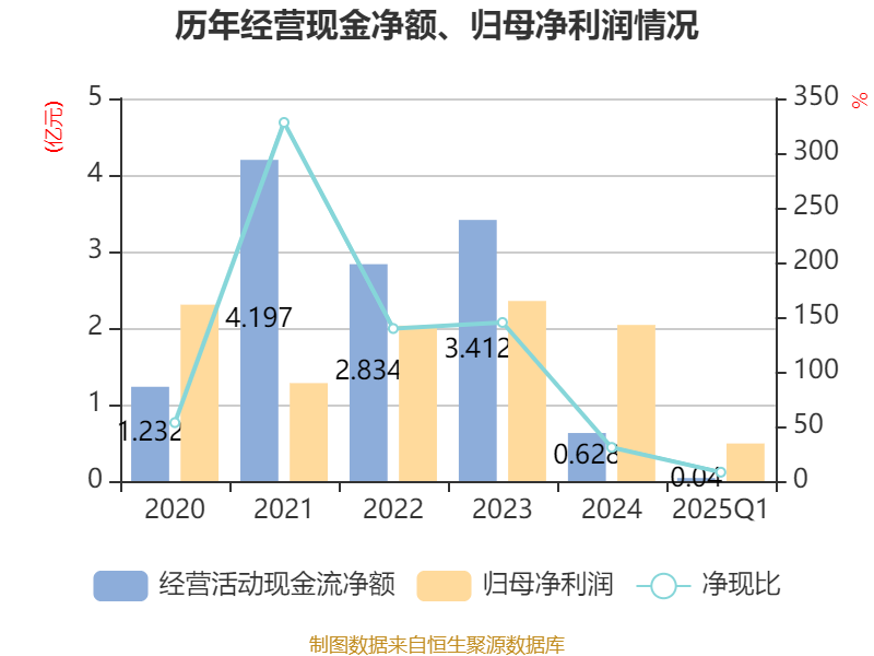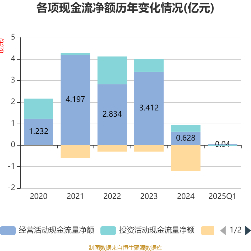 截至2025年一季度末,公司经营活动现金流净额为398.92万元,同比增加8113.12万元;筹资活动现金流净额0元,与同期相比基本不变;投资活动现金流净额-412.43万元,上年同期为-1112.38万元。