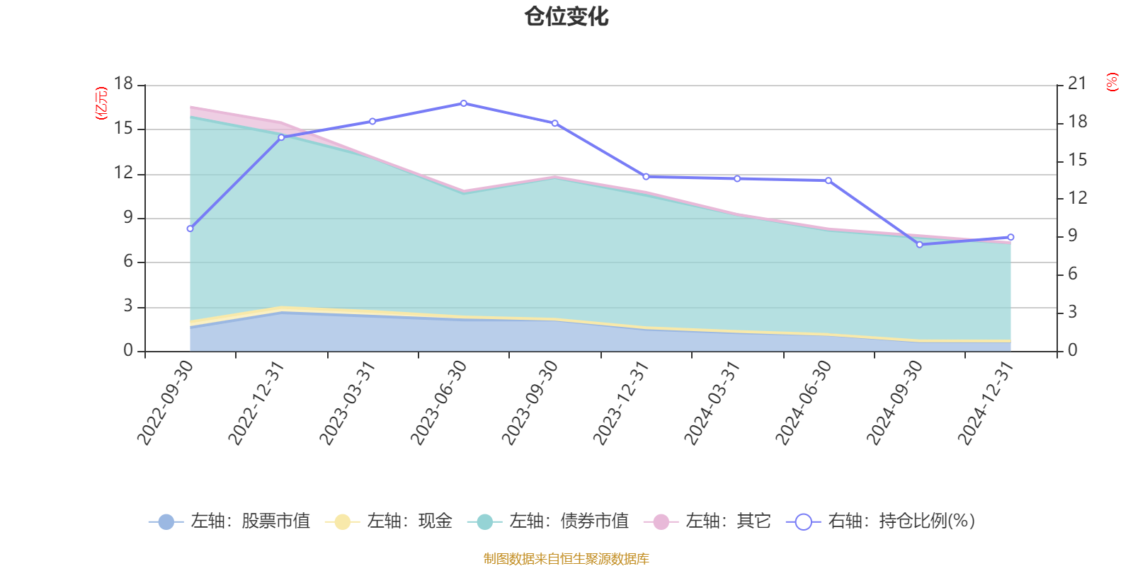 据定期报告数据统计,成立以来平均股票仓位为14.04%,同类平均为18.51%。2023年上半年末基金达到19.55%的最高仓位,2024年三季度末最低,为8.41%。