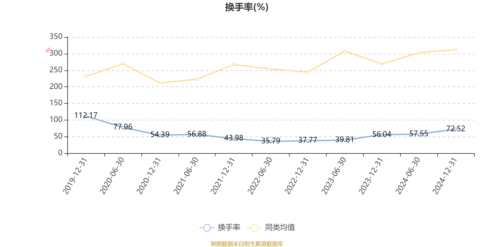截至2024年12月31日,基金最近一年换手率约129.69%,持续低于同类均值。