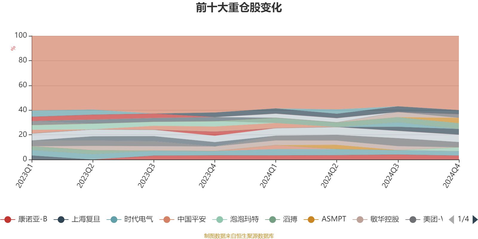 截至2024年末,基金十大重仓股分别是腾讯控股、吉利汽车、药明合联、FIT HON TENG、美团-W、时代电气、中国生物制药、康诺亚-B、泡泡玛特、招商银行。
