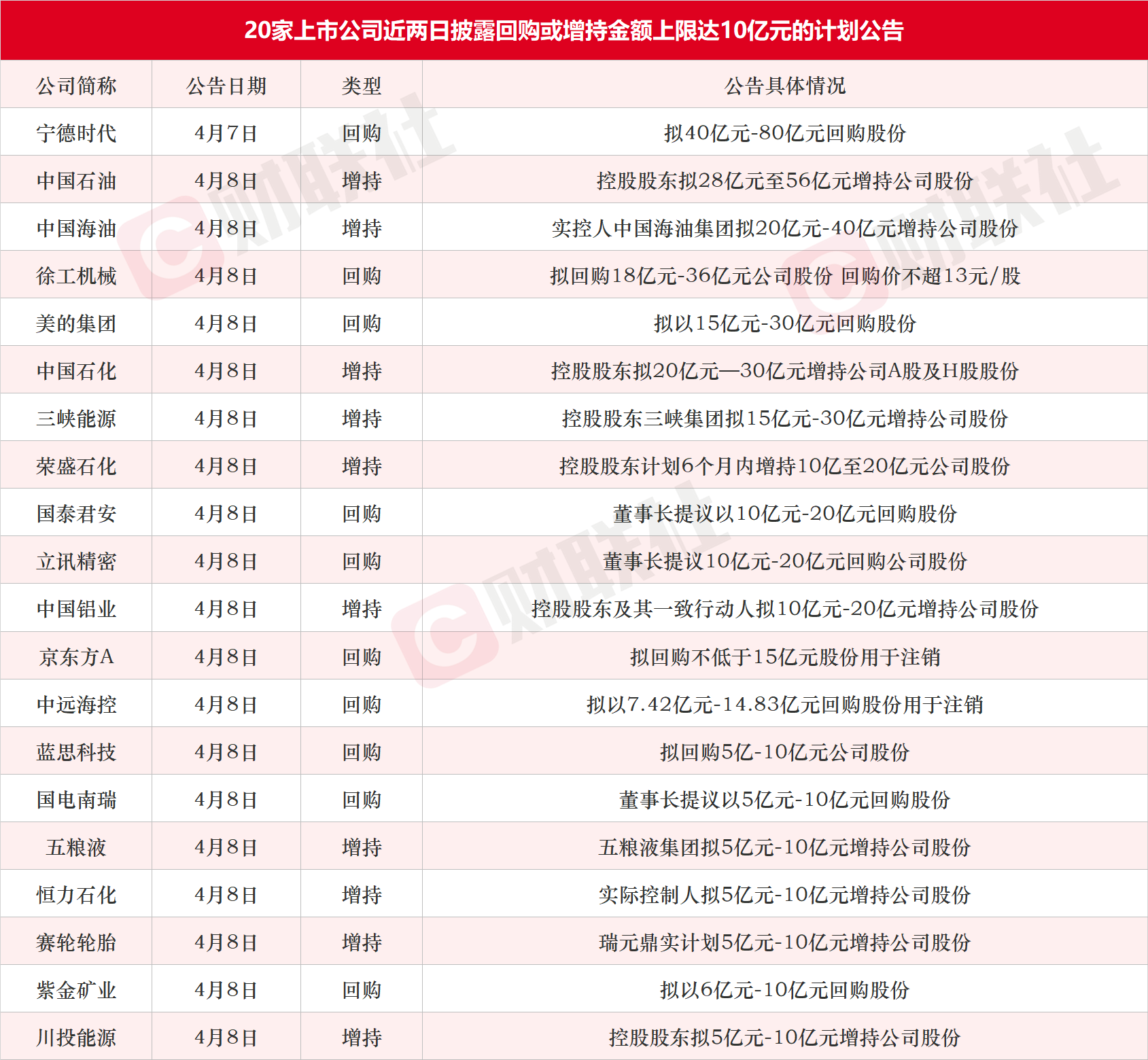 具体来看,宁德时代昨晚公告拟最高80亿元回购股份,涉及金额最大。中国石油午间公告控股股东拟28亿元至56亿元增持股份,位列第二。中国海油盘后公告实控人拟20亿元-40亿元增持股份,位列第三。此外,京东方A和中远海控公告拟回购股份用于注销。