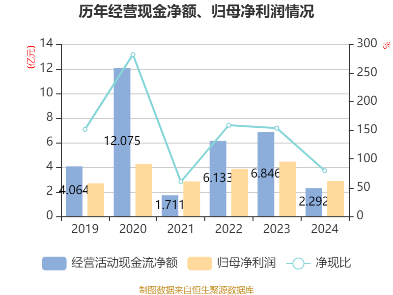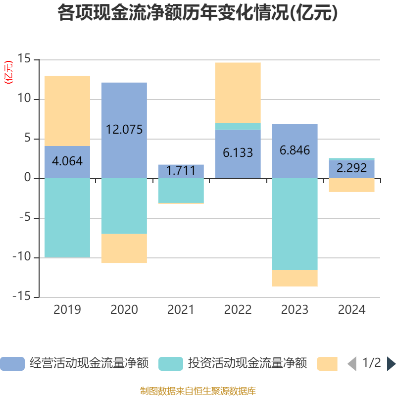 截至2024年,公司经营活动现金流净额为2.29亿元,同比下降66.52%;筹资活动现金流净额-1.74亿元,同比增加3559.92万元;投资活动现金流净额2457.8万元,上年同期为-11.57亿元。