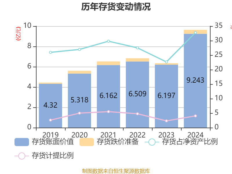 从存货变动来看,截至2024年末,公司存货账面价值为9.24亿元,占净资产的32.75%,较上年末增加3.05亿元。其中,存货跌价准备为3888.03万元,计提比例为4.04%。