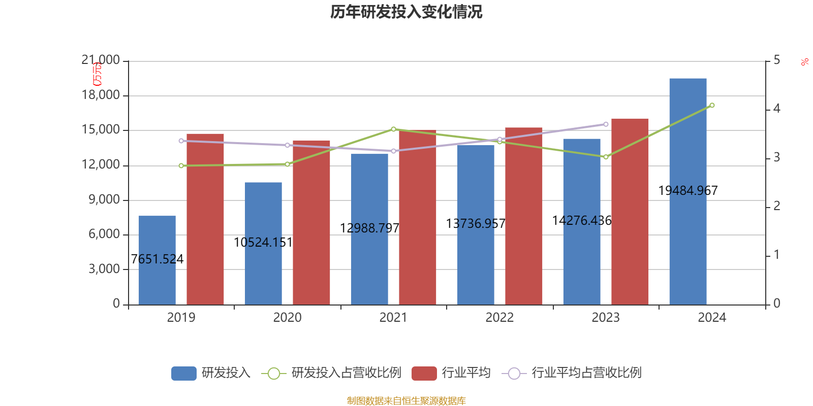 2024年全年,公司研发投入金额为1.95亿元,同比增长36.48%;研发投入占营业收入比例为4.09%,相比上年同期上升1.06个百分点。此外,公司全年研发投入资本化率为0%。
