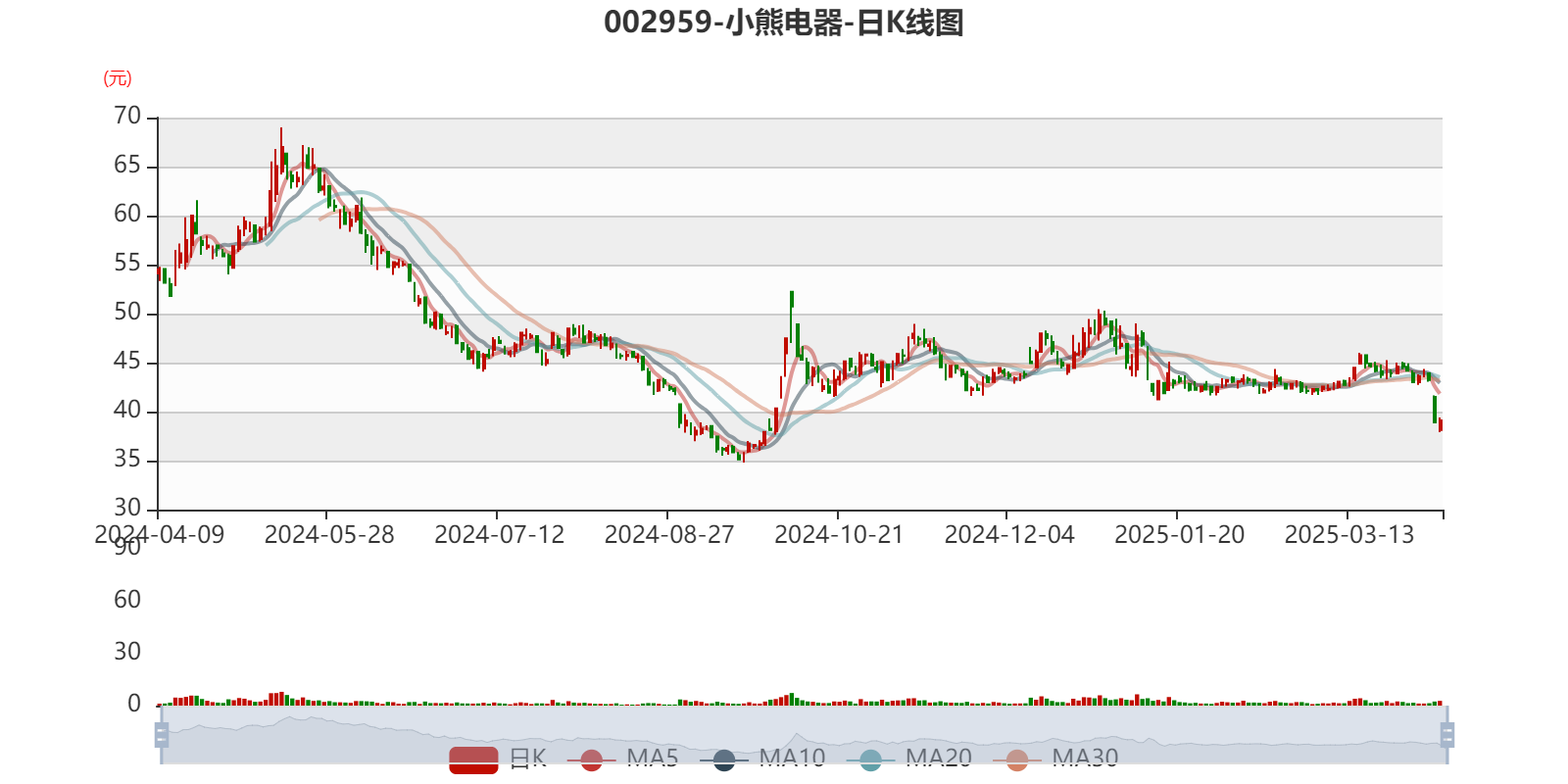 值得注意的是,中登公司数据显示,截至2025年4月3日,小熊电器15.22%股份处于质押状态。年报显示,第一大股东佛山市兆峰投资有限公司质押1300万股公司股份,占其全部持股的18.76%;第二大股东施明泰质押230万股公司股份,占其全部持股的17.31%。
