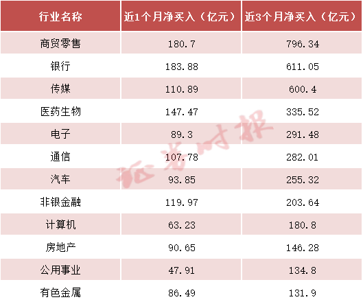 近1个月以来,南向资金净买入较多的行业包括商贸零售、银行、医药生物、传媒、非银金融等。