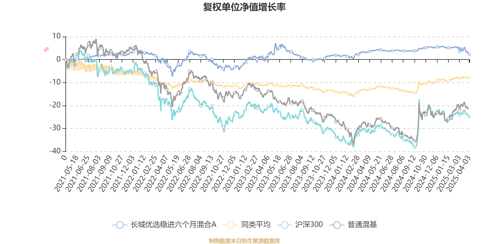 截至4月3日,长城优选稳进六个月混合A近三个月复权单位净值增长率为-2.73%,位于同类可比基金662/670;近半年复权单位净值增长率为-2.22%,位于同类可比基金653/670;近一年复权单位净值增长率为-1.32%,位于同类可比基金648/667;近三年复权单位净值增长率为3.06%,位于同类可比基金372/559。