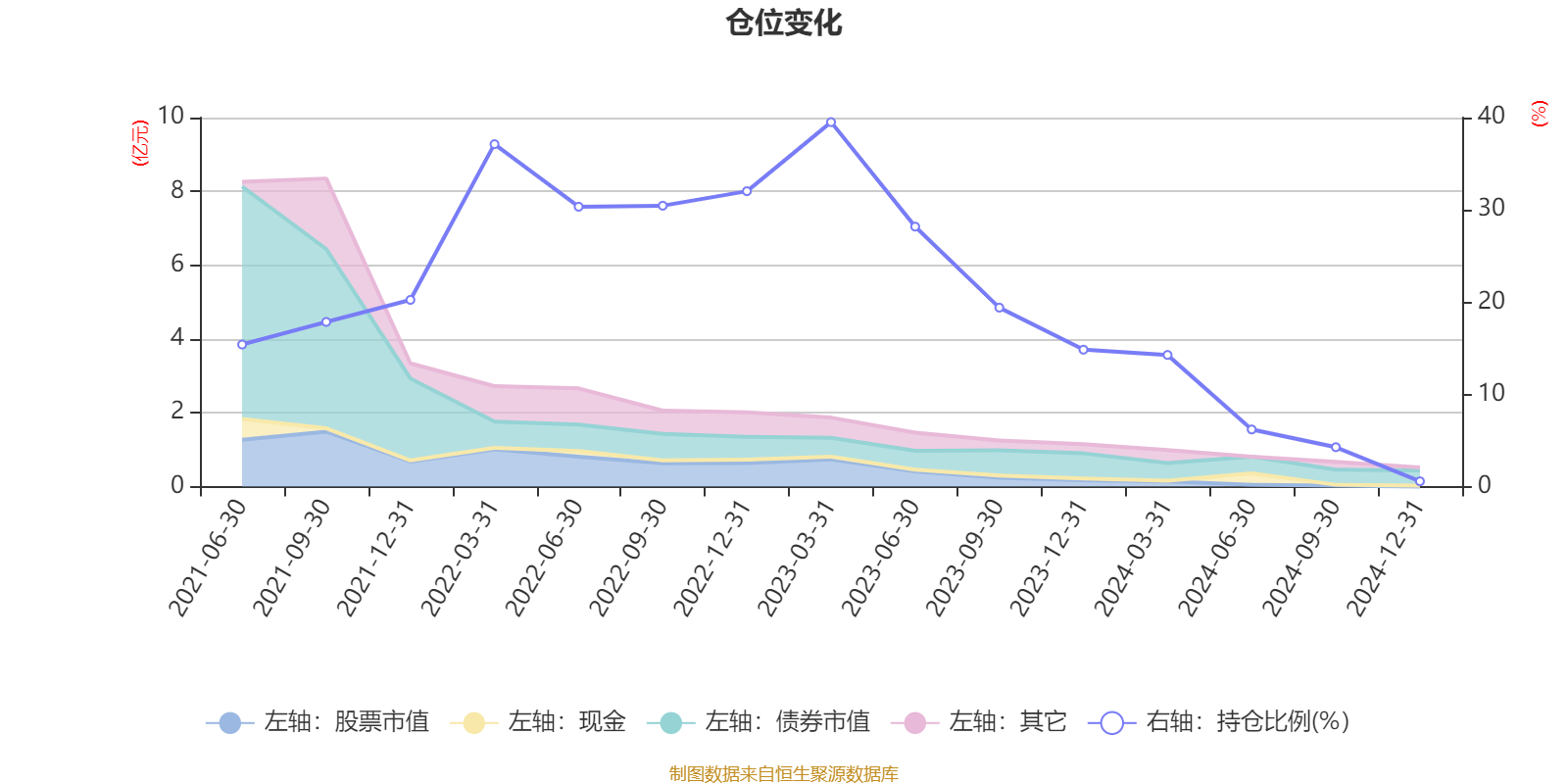 据定期报告数据统计,近三年平均股票仓位为21.43%,同类平均为18.74%。2023年一季度末基金达到39.51%的最高仓位,2024年末最低,为0.57%。