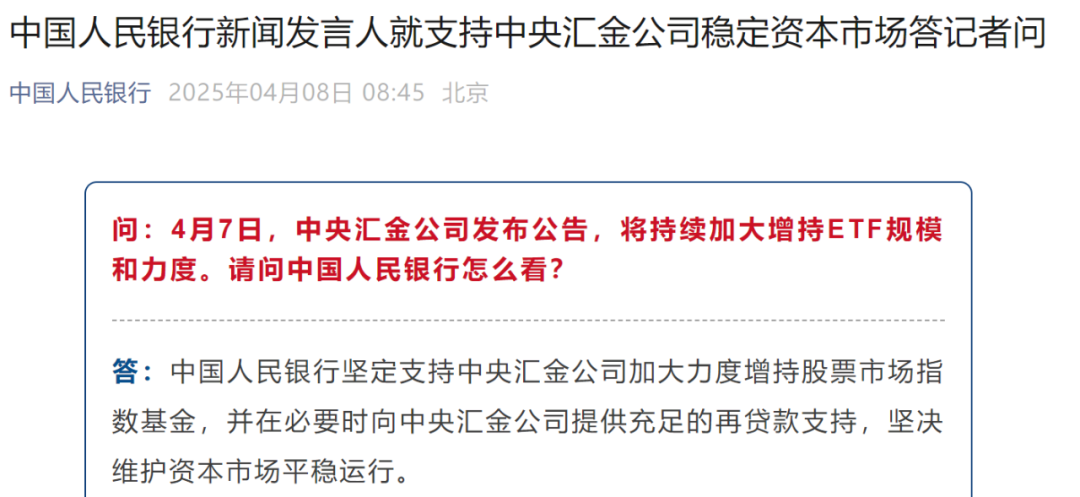 值得注意的是,4月8日,中国人民银行新闻发言人就支持中央汇金公司稳定资本市场答记者问表示,中国人民银行坚定支持中央汇金公司加大力度增持股票市场指数基金,并在必要时向中央汇金公司提供充足的再贷款支持,坚决维护资本市场平稳运行。