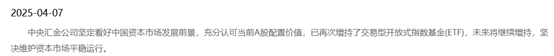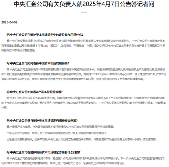 4月7日,中央汇金投资有限公司官网发布公告称:“中央汇金公司坚定看好中国资本市场发展前景,充分认可当前A股配置价值,已再次增持了交易型开放式指数基金(ETF),未来将继续增持,坚决维护资本市场平稳运行。”