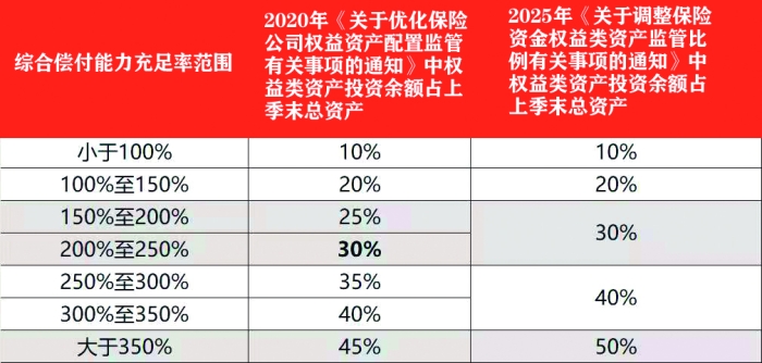 中泰证券非银金融首席分析师葛玉翔对上海证券报记者表示,《通知》简化档位标准,由过去7档优化调整为5档,将综合偿付能力充足率处于150%至200%、250%至300%和大于350%的3档险企对应的权益类资产比例上限上调5个百分点至30%、40%和50%,这进一步拓宽了险企权益投资空间。