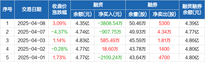 融资方面,当日融资买入1737.71万元,融资偿还5546.24万元,融资净偿还3808.54万元。融券方面,融券卖出3.02万股,融券偿还2.49万股,融券余量50.46万股,融券余额353.22万元。融资融券余额合计4.39亿元。