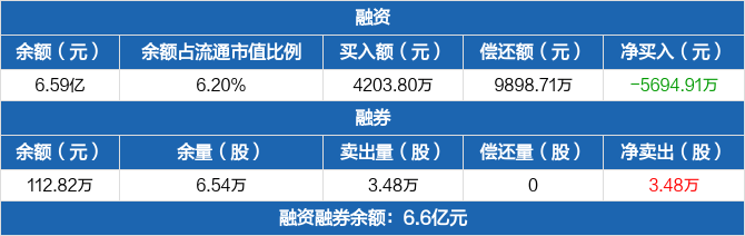 融资方面,当日融资买入4203.8万元,融资偿还9898.71万元,融资净偿还5694.91万元。融券方面,融券卖出3.48万股,融券偿还0股,融券余量6.54万股,融券余额112.82万元。融资融券余额合计6.6亿元。