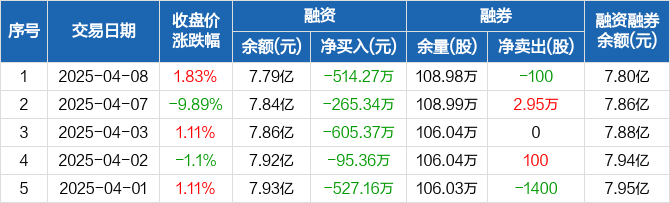 融资方面,当日融资买入648.28万元,融资偿还1162.55万元,融资净偿还514.27万元,连续6日净偿还累计2072.83万元。融券方面,融券卖出0股,融券偿还100股,融券余量108.98万股,融券余额182万元。融资融券余额合计7.8亿元。