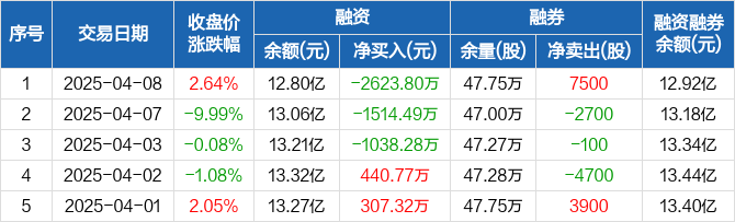 中国卫星融资融券信息显示,2025年4月8日融资净偿还2623.8万元;融资余额12.8亿元,较前一日下降2.01%。