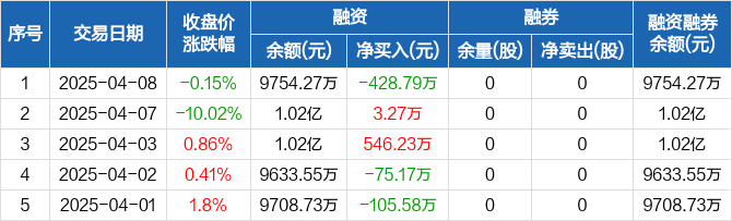融资方面,当日融资买入499.81万元,融资偿还928.6万元,融资净偿还428.79万元。融券方面,融券卖出0股,融券偿还0股,融券余量0股,融券余额0元。融资融券余额合计9754.27万元。