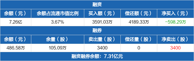 融资方面,当日融资买入3591.03万元,融资偿还4189.33万元,融资净偿还598.29万元。融券方面,融券卖出3400股,融券偿还0股,融券余量105.09万股,融券余额486.58万元。融资融券余额合计7.31亿元。
