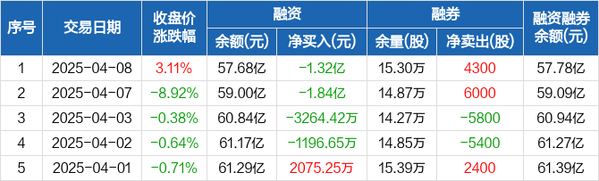 中科曙光融资融券信息显示,2025年4月8日融资净偿还1.32亿元;融资余额57.68亿元,较前一日下降2.24%