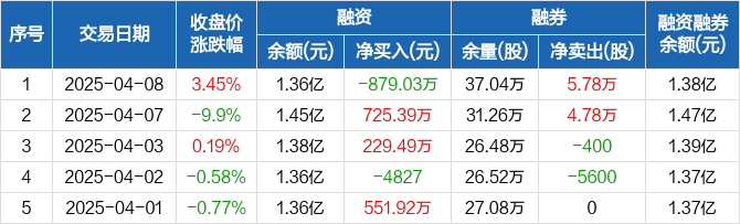 中国外运融资融券信息显示,2025年4月8日融资净偿还879.03万元;融资余额1.36亿元,较前一日下降6.05%