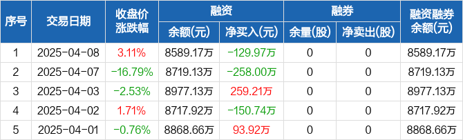 融资方面,当日融资买入387.21万元,融资偿还517.18万元,融资净偿还129.97万元。融券方面,融券卖出0股,融券偿还0股,融券余量0股,融券余额0元。融资融券余额合计8589.17万元。
