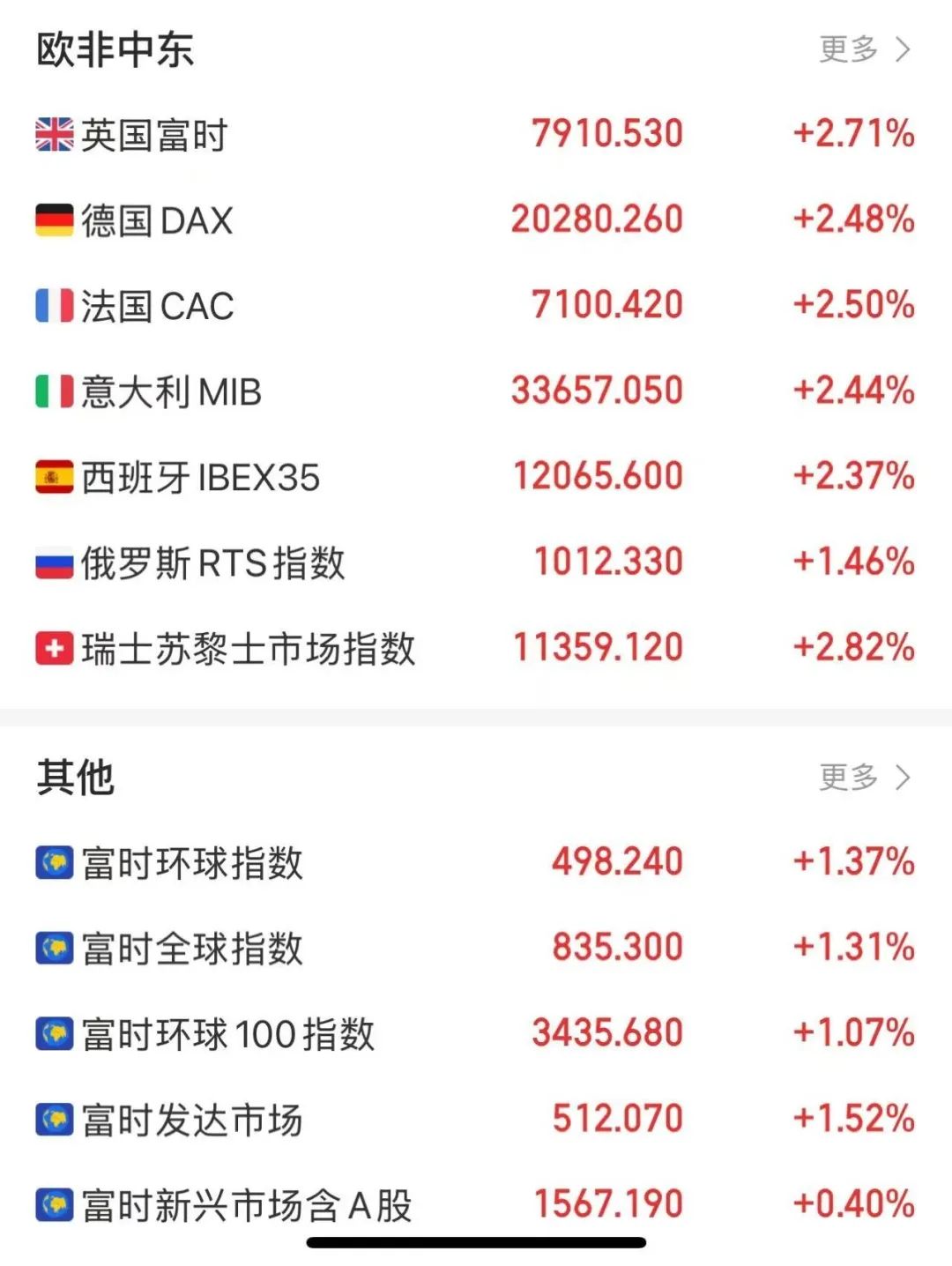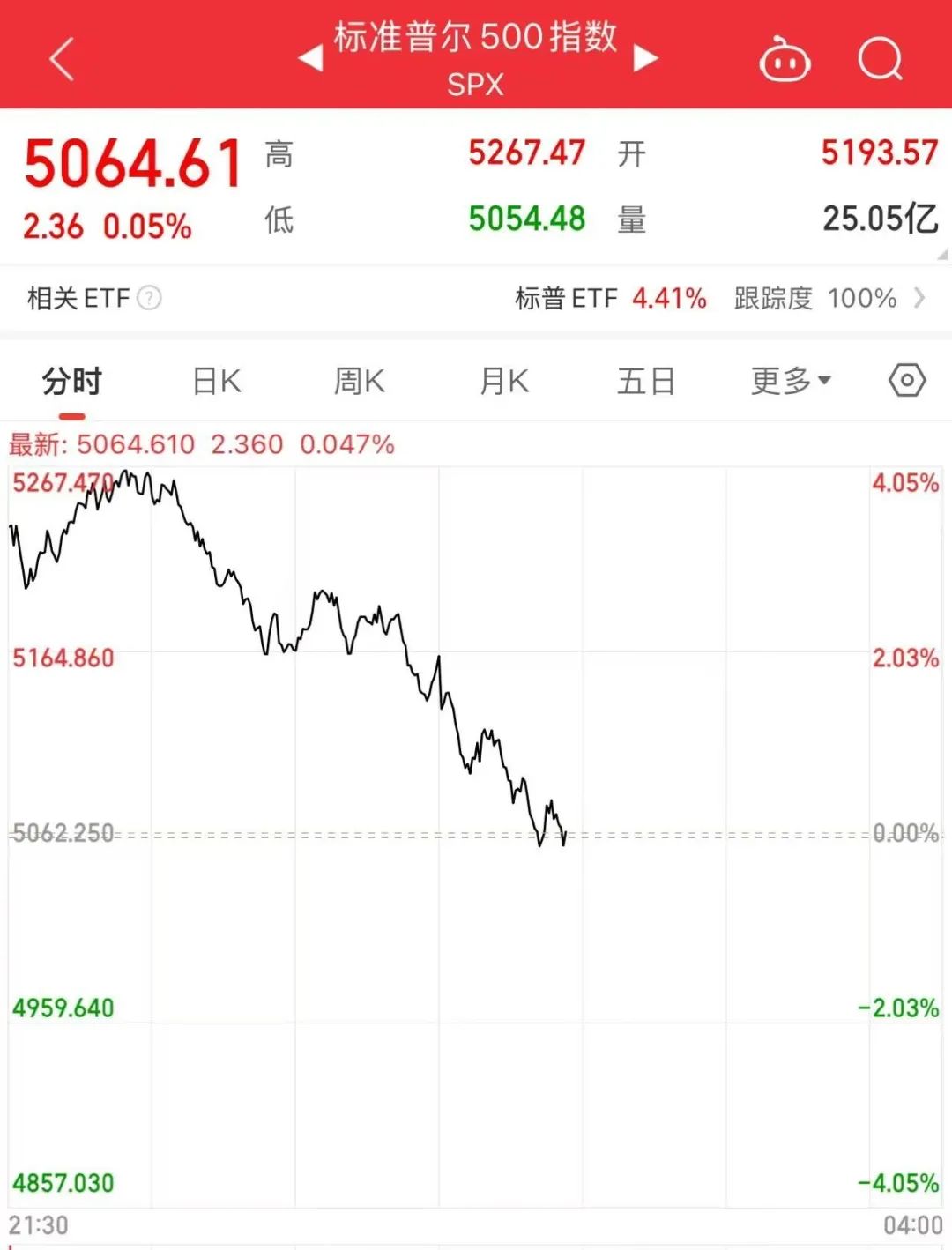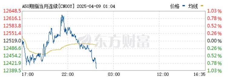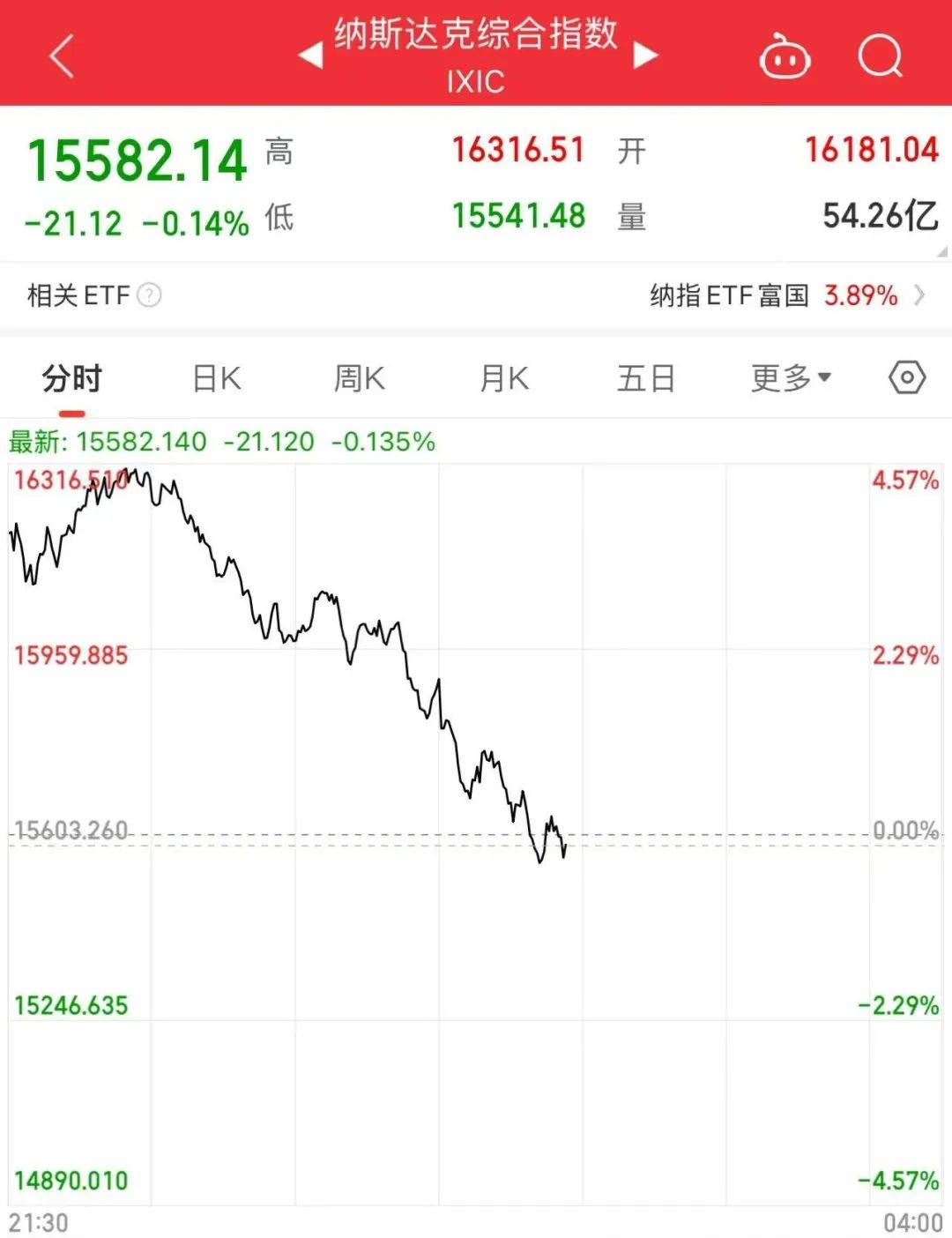 截至收盘,美股冲高回落,三大指数集体收跌,纳指收跌2.15%,盘中一度涨超4%;道指收跌0.84%,标普500指数收跌1.57%。道指盘中最高涨近4%,一度从高位跌超2300点。富时A50中国指数期货夜盘收跌1.59%,报12320点。