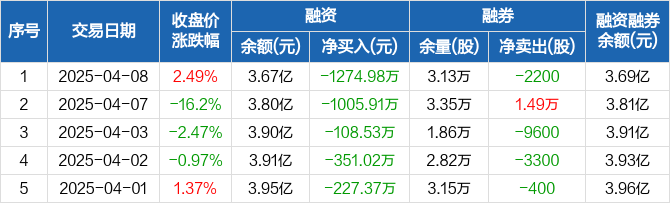 中信博融资融券信息显示,2025年4月8日融资净偿还1274.98万元;融资余额3.67亿元,较前一日下降3.36%