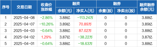 融资方面,当日融资买入141.32万元,融资偿还254.57万元,融资净偿还113.24万元。融券方面,融券卖出0股,融券偿还0股,融券余量0股,融券余额0元。融资融券余额合计3.88亿元。