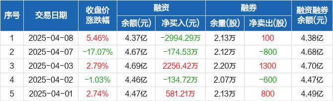 融资方面,当日融资买入2578.19万元,融资偿还5572.47万元,融资净偿还2994.29万元,净偿还额创历史新高。融券方面,融券卖出1000股,融券偿还900股,融券余量2.13万股,融券余额119.16万元。融资融券余额合计4.38亿元。