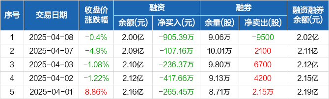 融资方面,当日融资买入3008.32万元,融资偿还3913.7万元,融资净偿还905.39万元,连续6日净偿还累计2449.05万元。融券方面,融券卖出1200股,融券偿还1.07万股,融券余量9.06万股,融券余额227.77万元。融资融券余额合计2.02亿元。