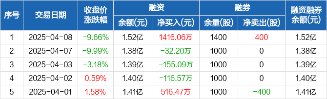 融资方面,当日融资买入2962.45万元,融资偿还1546.39万元,融资净买入1416.06万元。融券方面,融券卖出400股,融券偿还0股,融券余量1400股,融券余额1.49万元。融资融券余额合计1.52亿元。