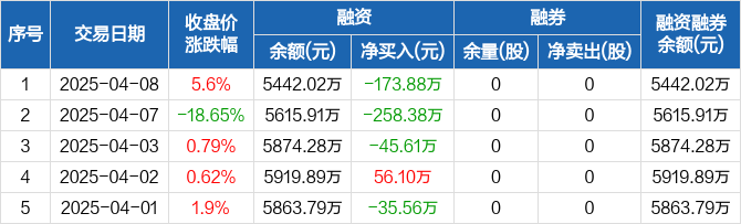 融资方面,当日融资买入344.93万元,融资偿还518.81万元,融资净偿还173.88万元,连续3日净偿还累计477.87万元。融券方面,融券卖出0股,融券偿还0股,融券余量0股,融券余额0元。融资融券余额合计5442.02万元。