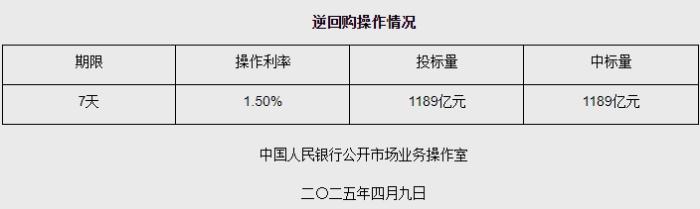 中新网4月9日电 据央行网站消息,2025年4月9日中国人民银行以固定利率、数量招标方式开展了1189亿元逆回购操作。具体情况如下:
