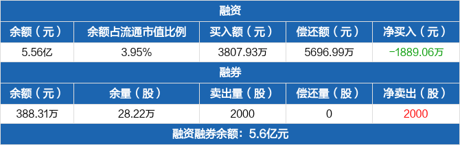 融资方面,当日融资买入3807.93万元,融资偿还5696.99万元,融资净偿还1889.06万元。融券方面,融券卖出2000股,融券偿还0股,融券余量28.22万股,融券余额388.31万元。融资融券余额合计5.6亿元。