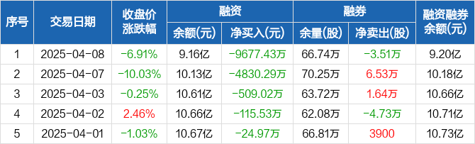 融资方面,当日融资买入6321.18万元,融资偿还1.6亿元,融资净偿还9677.43万元,连续6日净偿还累计1.61亿元。融券方面,融券卖出1.51万股,融券偿还5.02万股,融券余量66.74万股,融券余额440.48万元。融资融券余额合计9.2亿元。