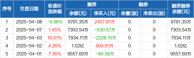融资方面,当日融资买入5870.9万元,融资偿还3413.09万元,融资净买入2457.81万元。融券方面,融券卖出0股,融券偿还0股,融券余量0股,融券余额0元。融资融券余额合计9761.35万元。