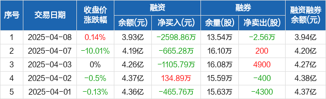 融资方面,当日融资买入1491.75万元,融资偿还4090.61万元,融资净偿还2598.86万元,净偿还额创12个月新高,连续3日净偿还累计4369.93万元。融券方面,融券卖出200股,融券偿还2.58万股,融券余量13.54万股,融券余额96.27万元。融资融券余额合计3.94亿元。