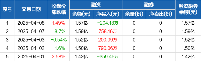 融资方面,当日融资买入1070.81万元,融资偿还1274.99万元,融资净偿还204.18万元。融券方面,融券卖出0份,融券偿还0份,融券余量0份,融券余额0元。融资融券余额合计1.57亿元。