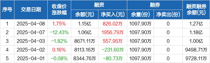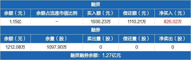 融资方面,当日融资买入1936.23万元,融资偿还1110.21万元,融资净买入826.02万元,连续3日净买入累计3340.76万元。融券方面,融券卖出0份,融券偿还0份,融券余量1097.9万份,融券余额1212.08万元。融资融券余额合计1.27亿元。